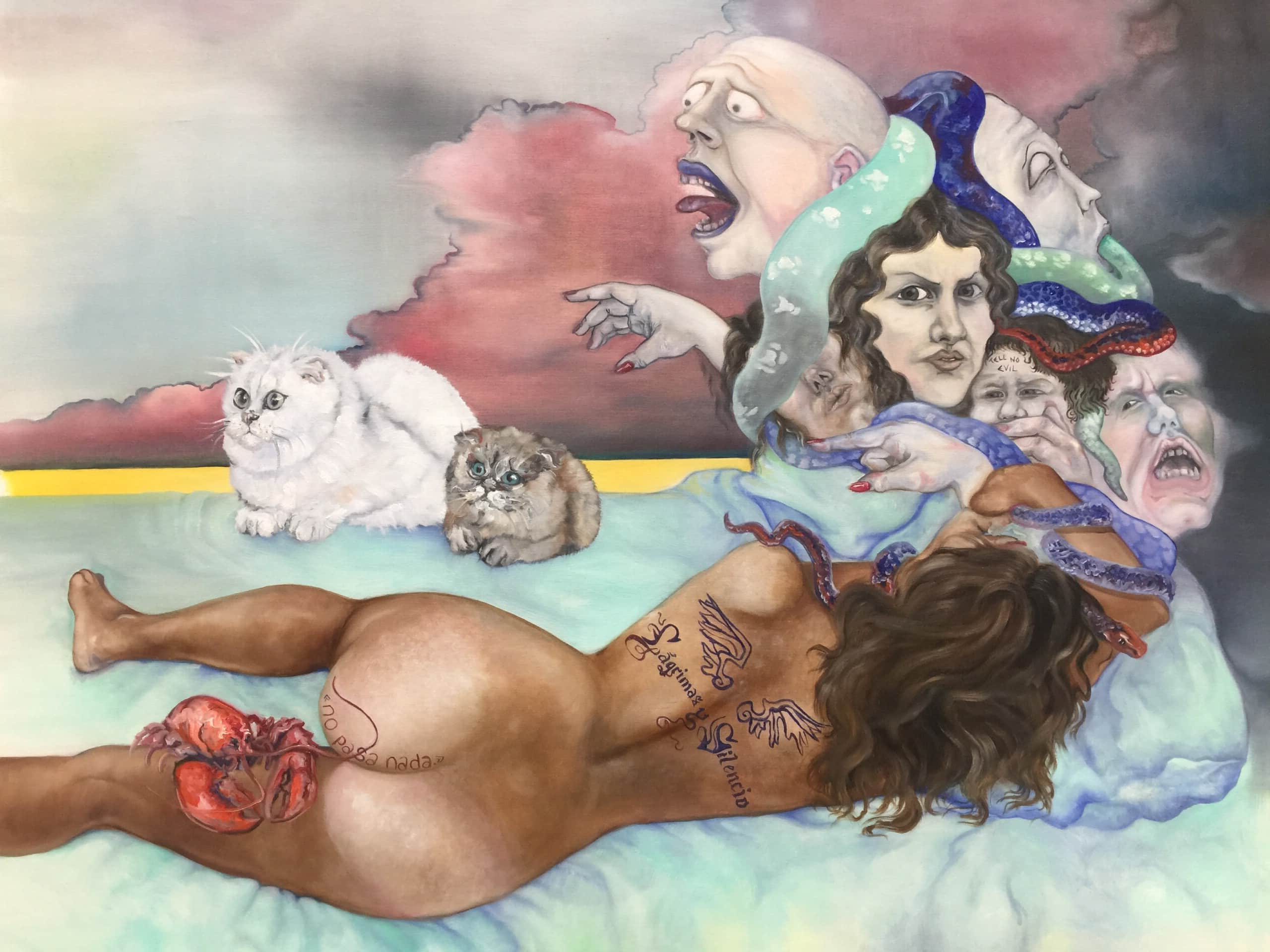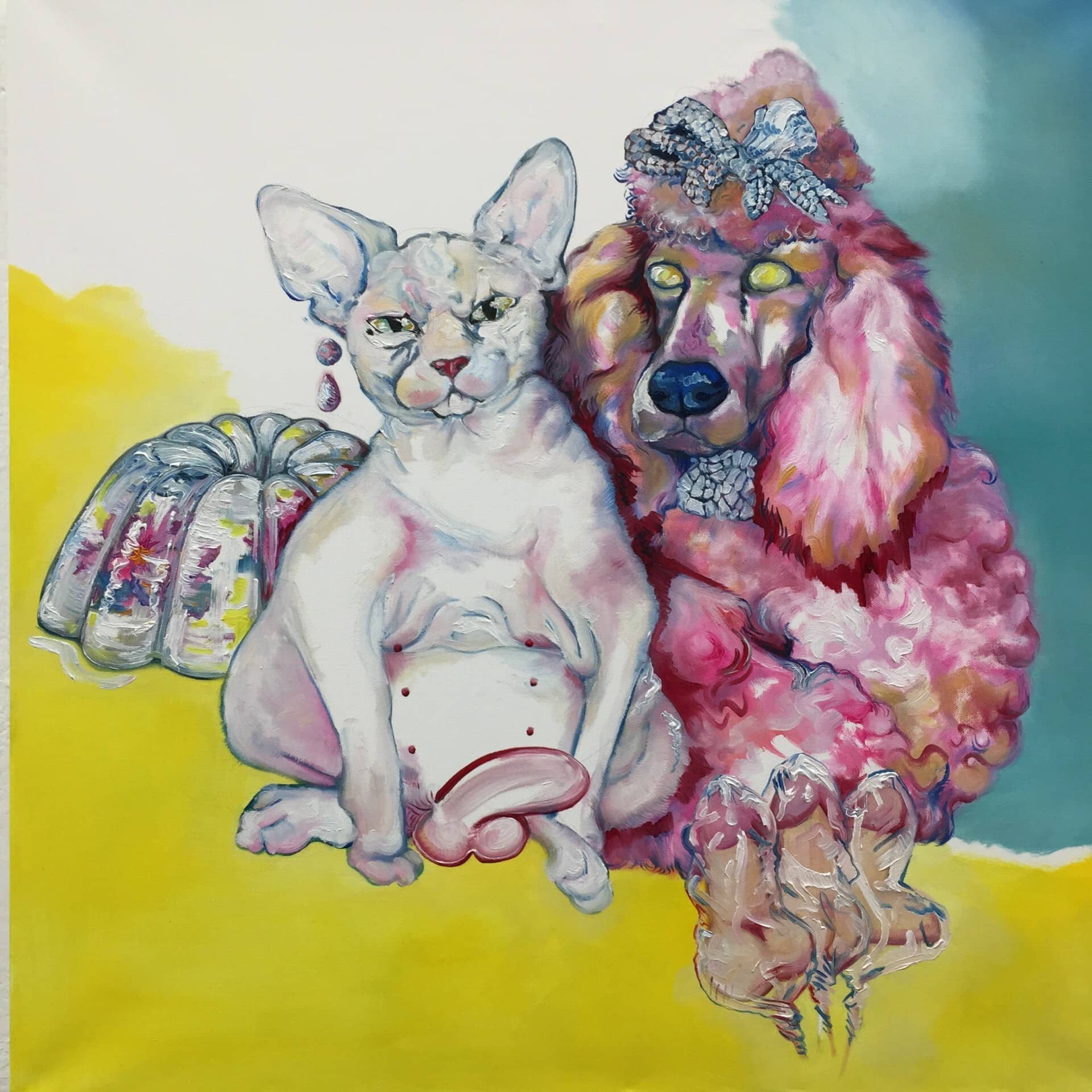Margaux Laurens-Neel, fraichement diplômée des beaux-arts de Paris et déjà bien entourée par des maîtres comme Joann Sfar ou Eric Poitevin, mobilise tant la peinture que la photographie et le dessin. Bestiale et charnelle, son œuvre est un voyage autour de l’interdit, une évocation constante de la transgression… Et de la sexualité. Omniprésente dans son travail, elle est aussi bien suggérée qu’affirmée avec provocation, dans une rhétorique choc et crue qui crie ouvertement son refus des codes édifiés par la société comme morale, bon goût, norme et tabous. L’érotisme y est ainsi constant. Que ce soit par le biais des symboles qui ponctuent l’œuvre (du fruit défendu1 à Vénus2, déesse de l’amour et de la séduction, au choix des animaux comme la pieuvre, le cochon, le chat, ou le lapin, en passant par celui des végétaux et des fruits3 comme la pivoine, la grenade ou le raisin) ou par le biais des couleurs et des tons – roses, puissants ou pastels, gourmands, parfois acidulés ou fermentés. Le nu y est évidemment partout et les corps que nous livre l’artiste nous offrent un tumultueux mélange des genres.